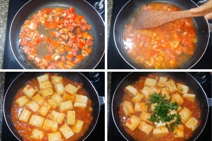 Cho đậu phụ ra dĩa rồi rưới phần sốt lên cho đẹp mắt và thưởng thức. Món ăn có màu vàng từ đậu, màu đỏ của cà chua và chút màu xanh của hành trông vô cùng bắt mắt.