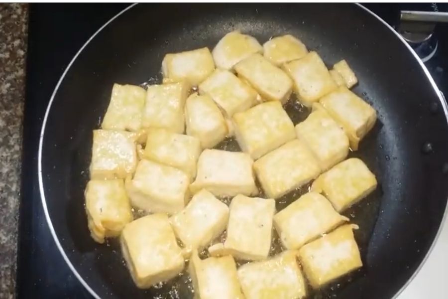 - Chuẩn bị chảo sạch, cho dầu vào chảo. Đợi dầu nóng thì cho đậu phụ vào để rán