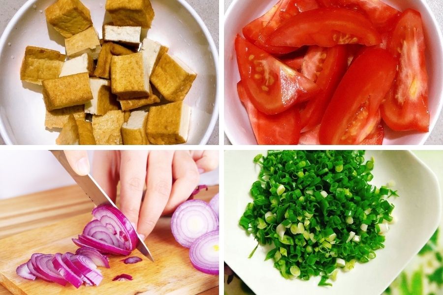 - Cà chua rửa sạch, bỏ cuống và thái múi cau.