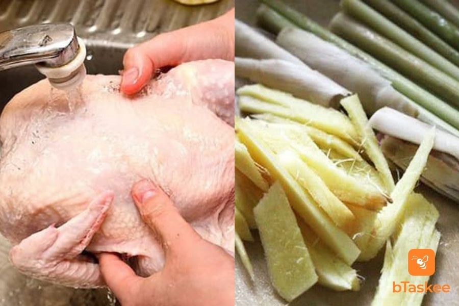 - Gà nguyên con đã được làm sạch, bạn rửa qua nước muối pha loãng, sau đó rửa sạch lại với nước, rồi để ráo. Để khử mùi hôi của thịt gà bạn dùng chanh và ít muối chà xát lên thịt gà và rửa lại nước sạch.