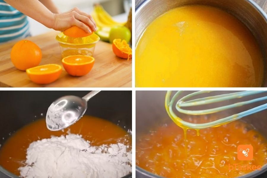 - Sau đó đun hỗn hợp với lửa nhỏ khoảng 10 – 15 phút đến khi hỗn hợp sệt lại thì tắt bếp. Khi đun bạn nhớ khuấy đều tay để nước cam không bị vón cục.