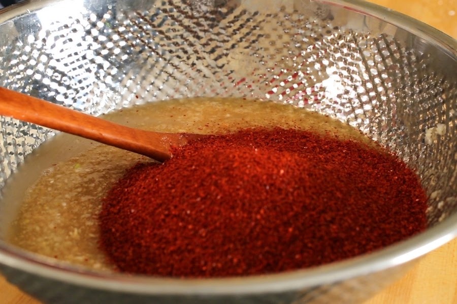 - Cho hết bột ớt Hàn Quốc, gừng, tỏi, đường, nước mắm vào một cái tô lớn, khuấy đều.