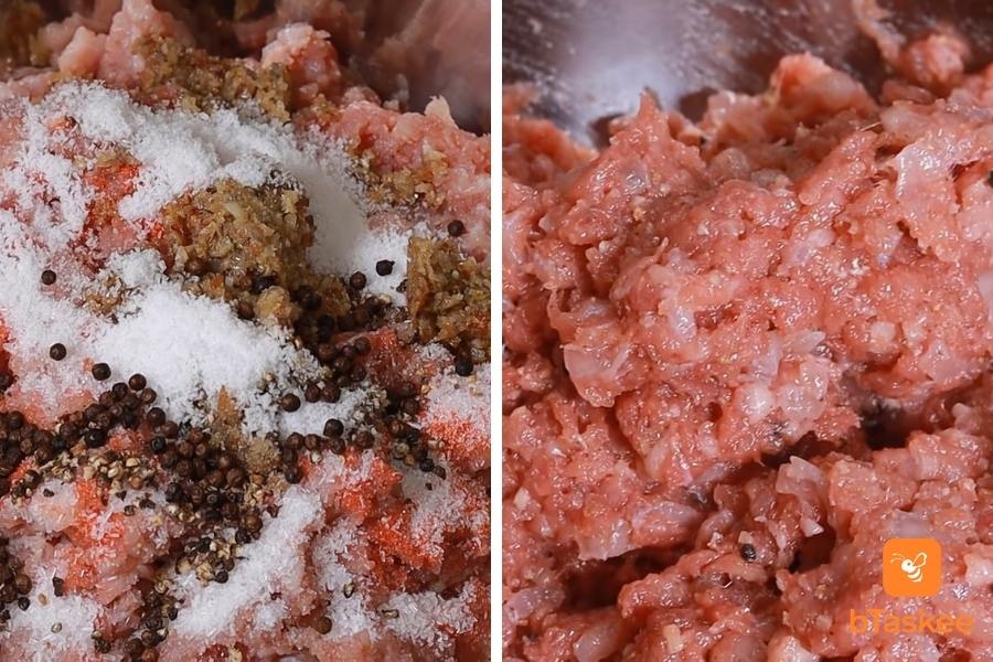 - Sau đó bạn cho vào tô 500g thịt heo xay cùng với phần gia vị vừa pha, rồi trộn đều.