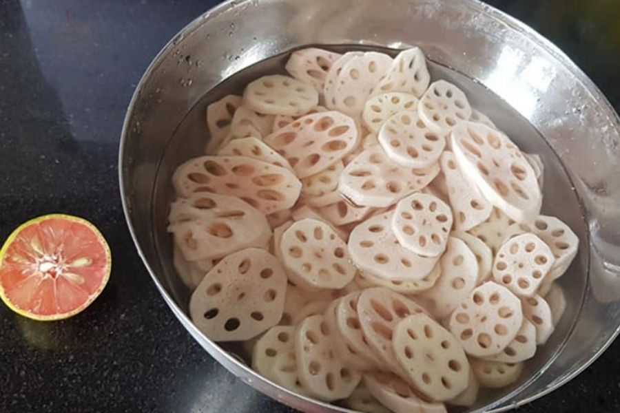 Củ sen rửa sạch, gọt bỏ lớp vỏ ngoài, rồi cắt thành miếng tròn vừa ăn. Rồi ngâm ngay vào nước muối pha loãng trong 10-15 phút. Cách này giúp củ sen không bị thâm đen, thành phẩm hoàn thành đẹp mắt hơn.