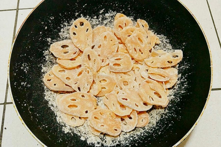 Sau 2 tiếng, cho tất cả phần củ sen đã ướp vào chảo sên với lửa vừa. khi ngâm xong, cho hỗn hợp này vào chảo và đun trên bếp với lửa vừa. Bạn nhớ đảo đều cho đường ngấm vào củ sen.
