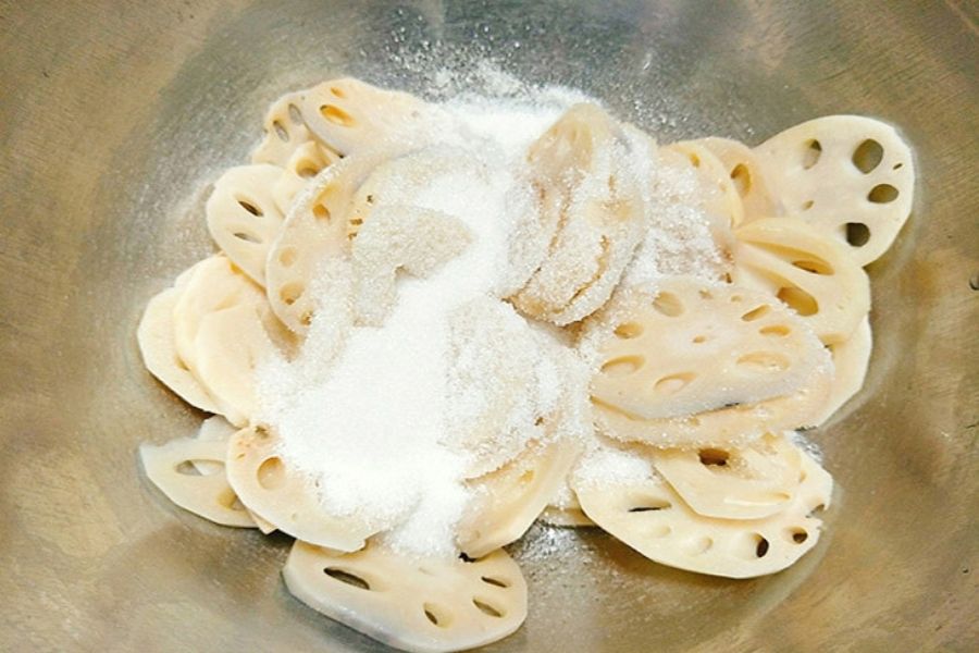 Cho 500g đường, 1 ống vani vào củ sen, ướp trong vòng 2 tiếng, để củ sen thấm gia vị. Bạn thấy đường đã tan chảy hết và củ sen có phần trong lại là được. Tùy khẩu vị của gia đình mà bạn gia giảm lượng đường cho phù hợp.