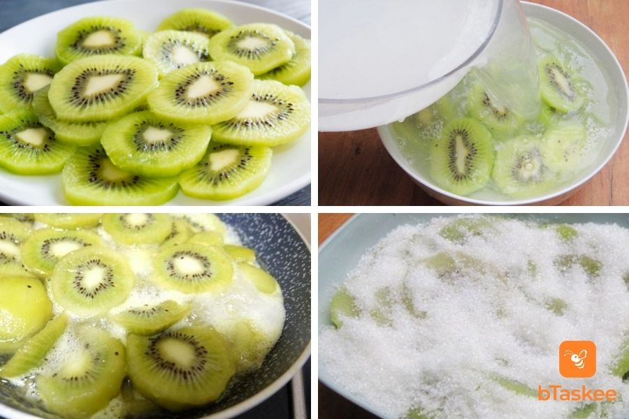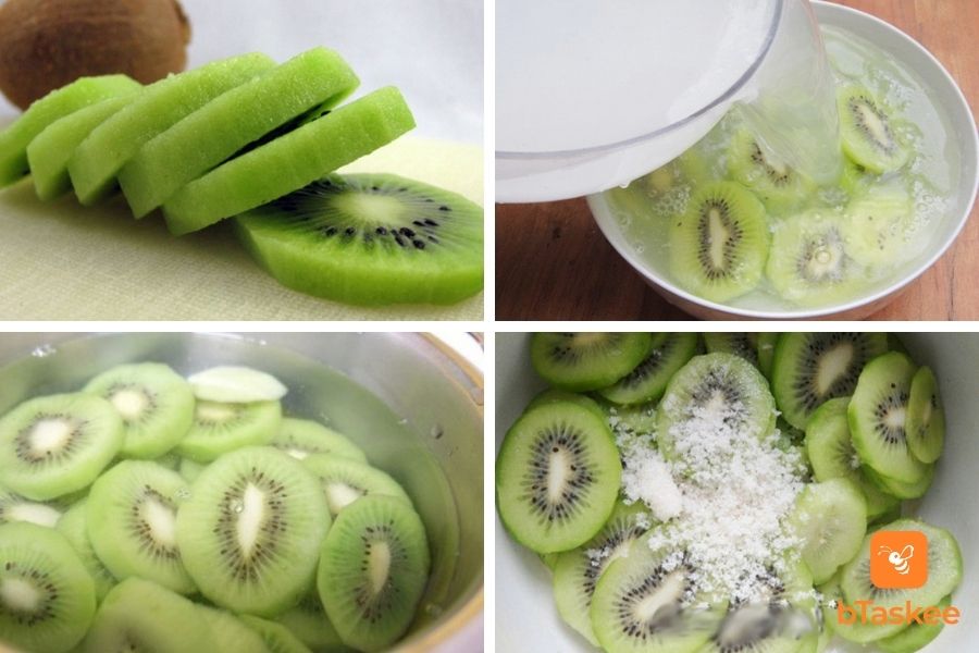 - Kiwi khi mua về bạn gọt bỏ vỏ, cắt dọc trái thành các khoanh tròn dày khoảng 0.8 cm và ngâm trong nước vôi trong đã chuẩn bị khoảng 3 – 4 tiếng.