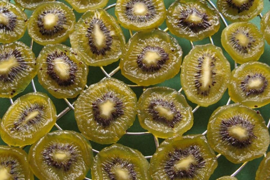 Ngoài mứt Kiwi dẻo thì mứt Kiwi sấy khô cũng được nhiều nhiều người yêu thích. Cách để làm mứt Kiwi khô vô cùng đơn giản. Nguyên liệu, bước sơ chế và sên Kiwi các bạn tiến hành và thực hiện làm mứt kiwi giống như chia sẻ trên: