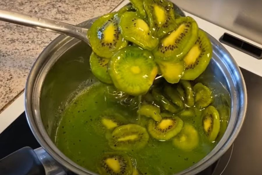 - Rồi cho kiwi vào sên với lửa nhỏ. Sên cho đến khi nước đường cạn bớt và thấm vào các lát kiwi săn lại và mứt kiwi chuyển thành màu trong là được.
