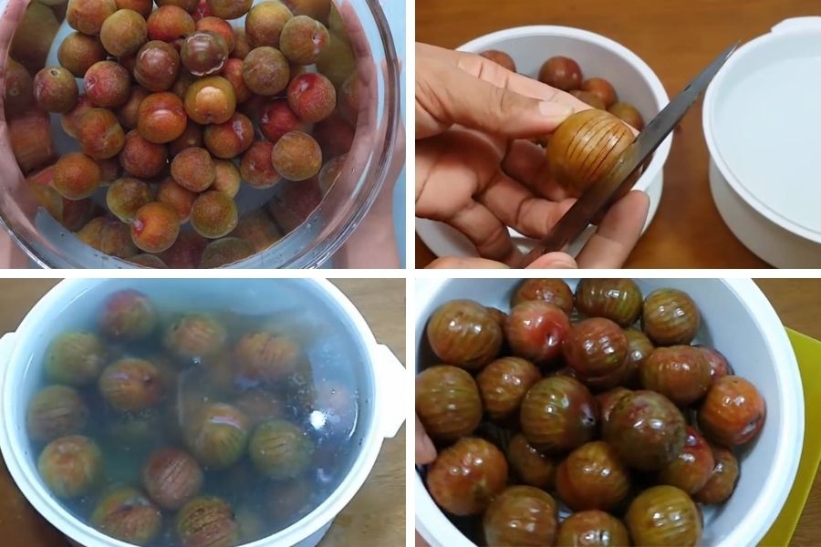 Cho mận vào ngâm với nước vôi khoảng 4 tiếng. Nên dùng dao khứa vài đường sâu xung quanh quả mận để mận được thấm hơn. Sau khi ngâm xong thì rửa lại mận nhiều lần với nước sạch.
