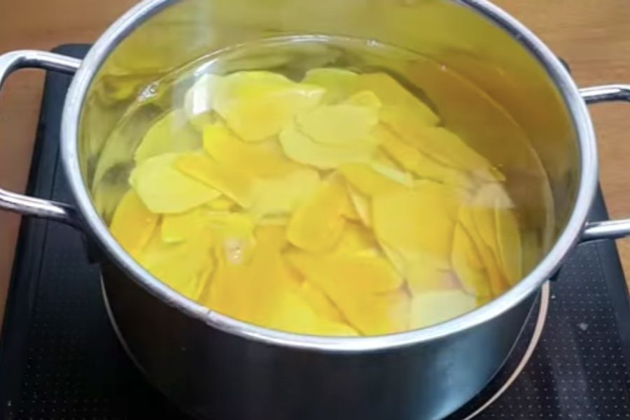 - Đun sôi nước, đến khi nước sôi thì bạn cho nghệ vào luộc khoảng 15 phút. Lấy nghệ ra và rửa lại với nước cho thật sạch.