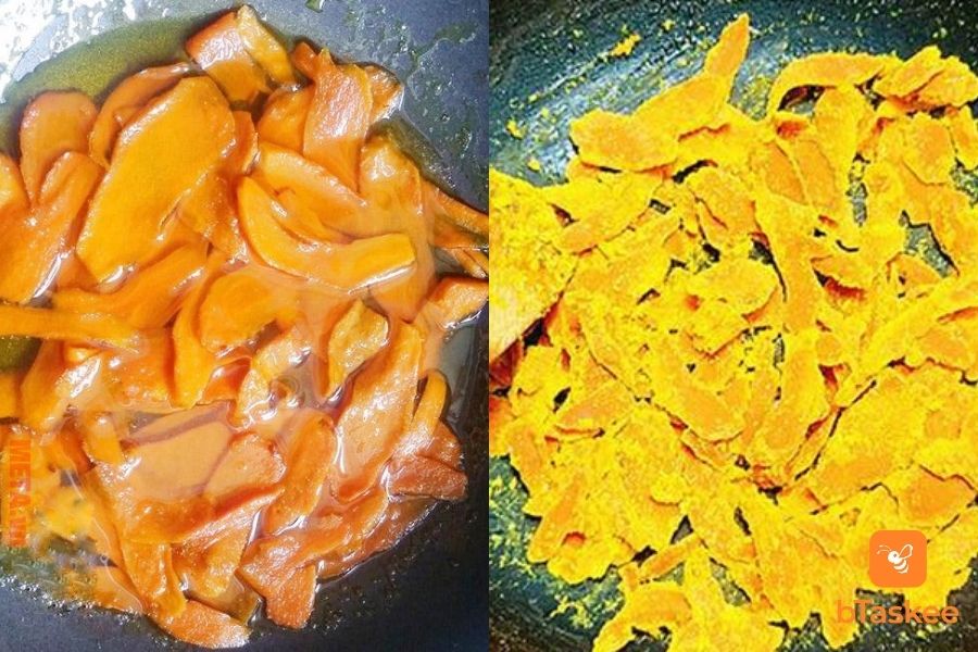 - Bạn cho hết phần nghệ, nước đường mật ong vào chảo. Bật bếp đun cho nước đường mật ong sôi lên thì để lửa nhỏ vừa và sên trong 2 giờ cho mứt ngấm đường.