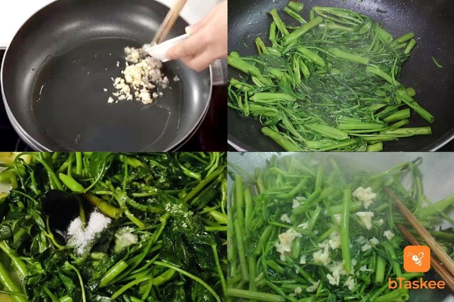 - Khi tỏi vàng thơm, bạn cho hết rau muống vào xào đều tay trên lửa lớn rồi cho thêm 1/4 chén nước lọc vào và tiếp tục xào khoảng 5 phút cho rau chín.