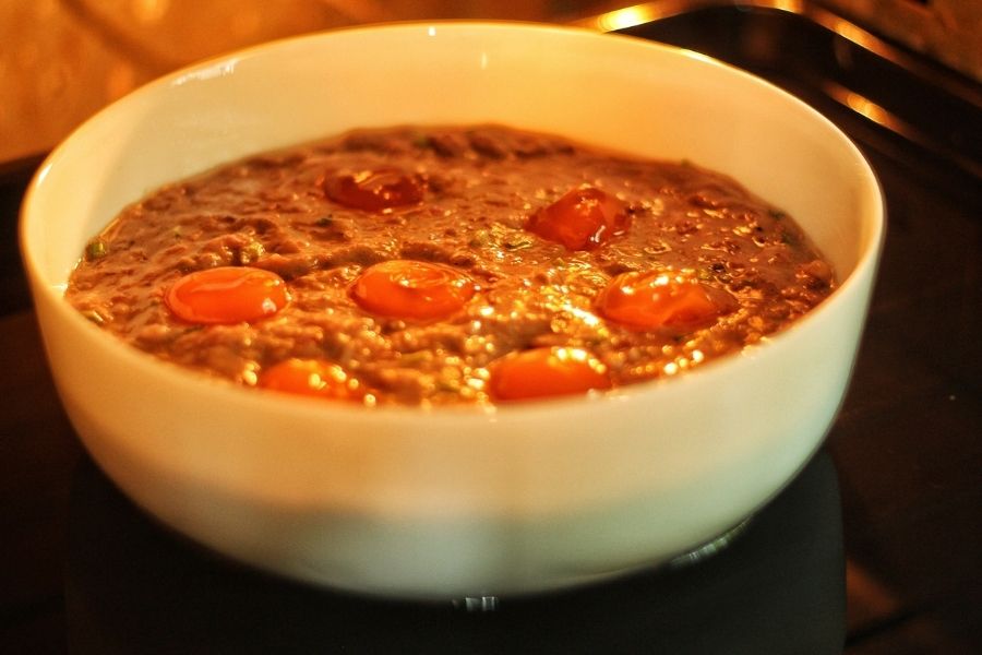 Cho hỗn hợp đã trộn đều vào tô sứ/ thủy tinh…( có thể nấu ở nhiệt độ cao được). Tiếp đến, cho 6 lòng đỏ trứng muối lên trên mặt hỗn hợp rồi mang đi chưng (hấp) trong nồi hấp, chưng cách thủy ở lửa vừa trong vòng 60 phút. Ngoài ra, bạn cũng có thể nướng cách thủy trong lò ở nhiệt độ 180 độ C trong 60 phút.