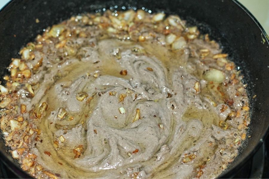Đây chính là bí quyết cho món thịt chưng mắm tép dậy mùi và thơm ngon hơn. Bạn chỉ cần cho dầu ăn vào chảo, đợi dầu nóng rồi cho tỏi, hành tím và sả đã băm nhỏ vào để phi thơm. Sau đó, cho mắm tép vào xào sơ cho dậy mùi.