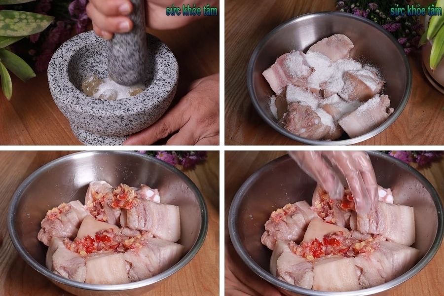 Thịt heo sau khi mua về bạn cạo sạch và rửa qua nước muối pha loãng. Rửa lại với nước và cắt nhỏ thành những khối vừa ăn.