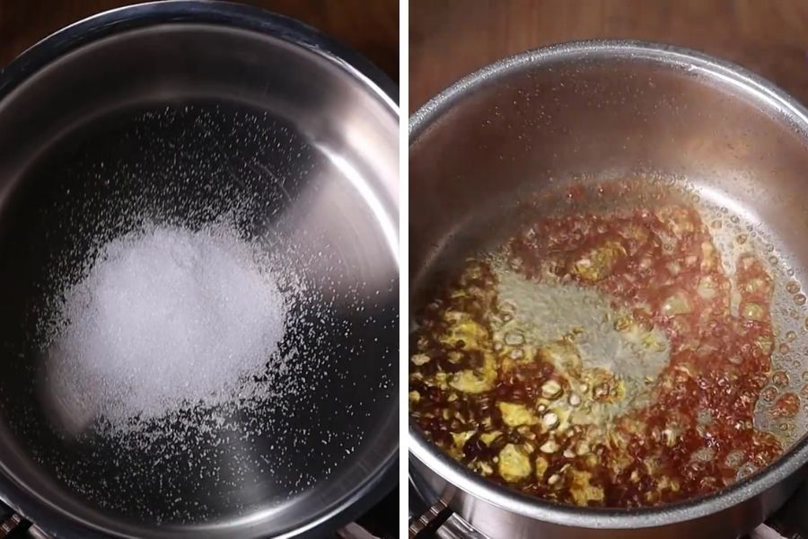 Bạn cho 1,5 muỗng canh đường vào trong nồi và bắc lên bếp ở lửa vừa. Khi đường đã tan ra và có màu vàng đậm thì bạn cho 3 muỗng canh nước lọc vào. Khuấy đều đến khi đường nước hòa quyện vào nhau cho ra màu cánh gián đẹp mắt là được.