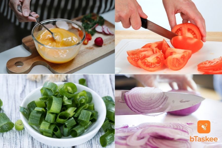 - Cà chua mua về rửa sạch, bạn cắt múi cau hoặc vuông nhỏ tùy ý. Hành tím lột vỏ, rửa sạch rồi cắt lát. Hành lá rửa sạch cắt nhỏ.