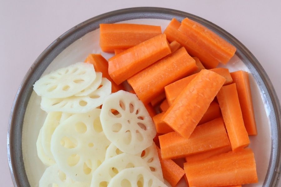 Cà rốt gọt vỏ, cắt thành khúc vừa ăn, có thể tỉa hoa để món ăn thêm đẹp mắt.