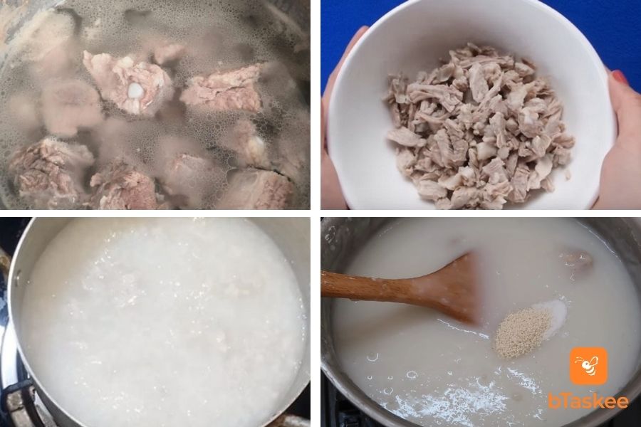 - Khi cháo đã mềm bạn thêm thịt sườn đã xé vào nồi cháo. Cho 1 muỗng cà phê muối và 2 muỗng cà phê hạt nêm vào nêm nếm. Bạn cân chỉnh cho hợp khẩu vị, khuấy đều rồi tắt bếp.
