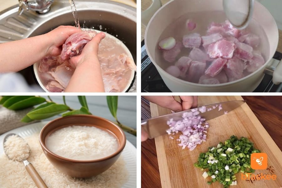 - Gạo tẻ vo sạch sau đó đổ vào 300ml nước, ngâm gạo ngập nước trong khoảng 3 giờ đồng hồ để cho gạo mềm bớt. Ngâm xong để gạo ráo nước, rồi cho vào máy xay, xay nhỏ để nấu cháo nhanh hơn.