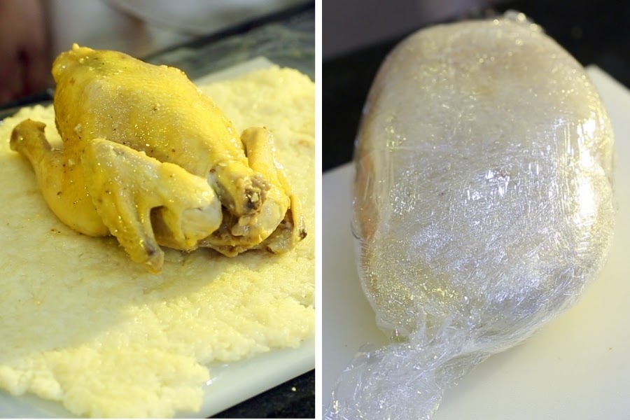 - Cho xôi vào màng bọc thực phẩm và dàn mỏng. Sau đó đặt gà vào chính giữa lớp xôi rồi dồn xôi bọc gà lại.