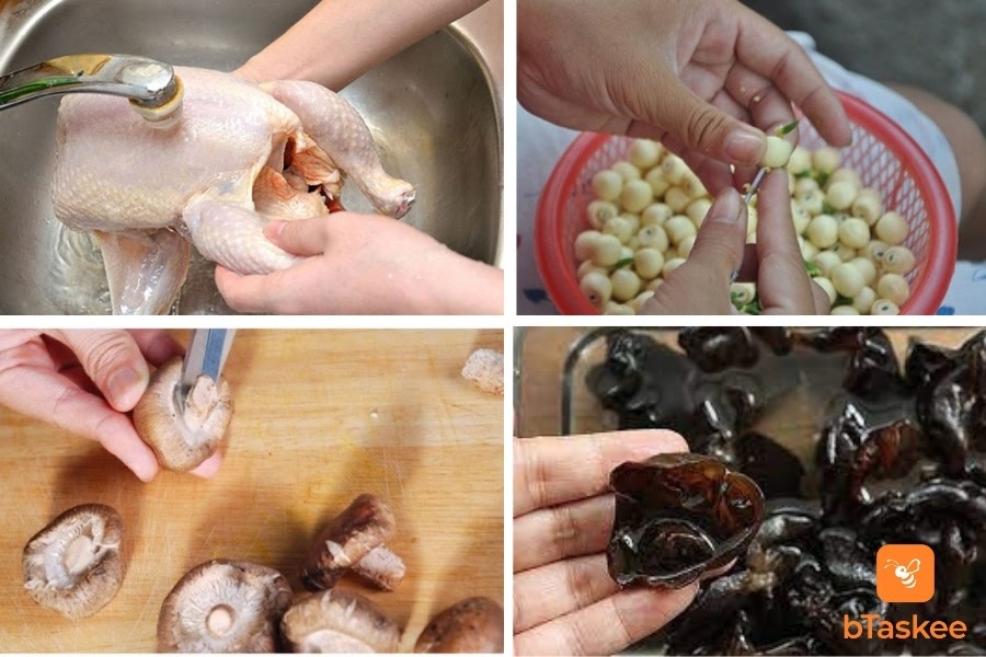 Trong thời gian ngâm nếp, bạn bắc một cái chảo lên bếp cho dầu ăn vào, phi thơm hành tím và gừng. Tiếp đến cho hạt sen, nấm mèo, nấm hương vào xào cùng nhau. Nêm thêm tiêu, nước mắm, bột ngọt, hạt nêm cho vừa khẩu vị và xào chín hỗn hợp.