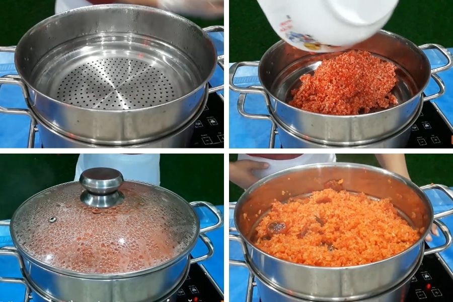 Cho hỗn hợp gạo đã trộn vào xửng hấp và đem đi hấp cách thủy. Hấp trong vòng khoảng 40 – 60 phút là xôi đã chín.