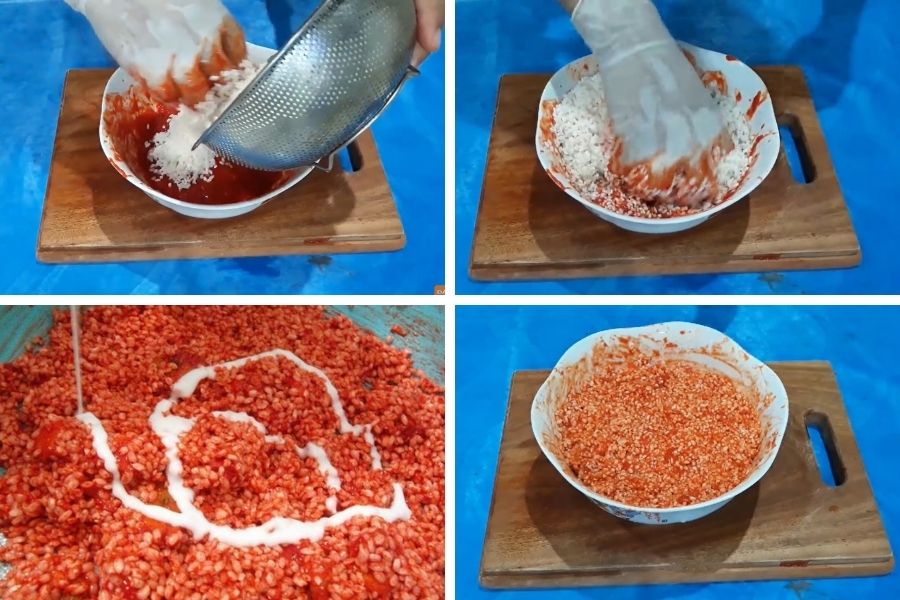 Trộn phần thịt gấc đã tách với gạo nếp sau khi ngâm, cho thêm 1 muỗng cà phê muối. Trộn nhẹ nhàng và đều tay cho đến khi nếp được nhuộm một màu đỏ thật đẹp và đều.