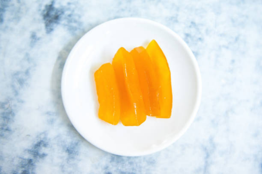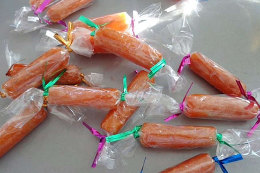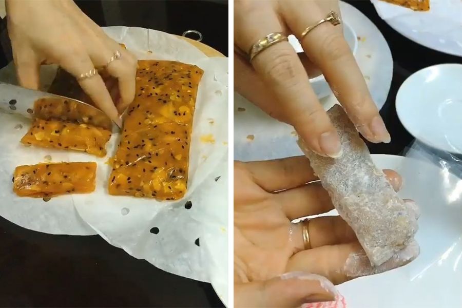 - Lấy mứt ra để nguội sau đó cuộn tròn và cắt miếng theo sở thích để ăn.