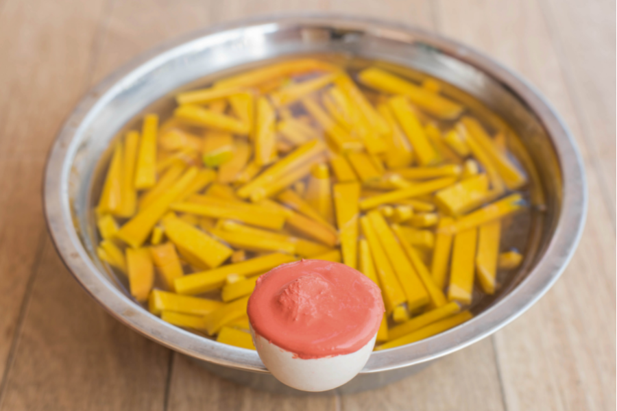 - Cho bí đỏ đã cắt vào nước vôi đã hòa tan sẵn với muối trong hai giờ. Sau đó, vớt ra rổ và rửa lại nhiều lần với nước sạch. Dùng khăn thấm khô phần nước trên bí.