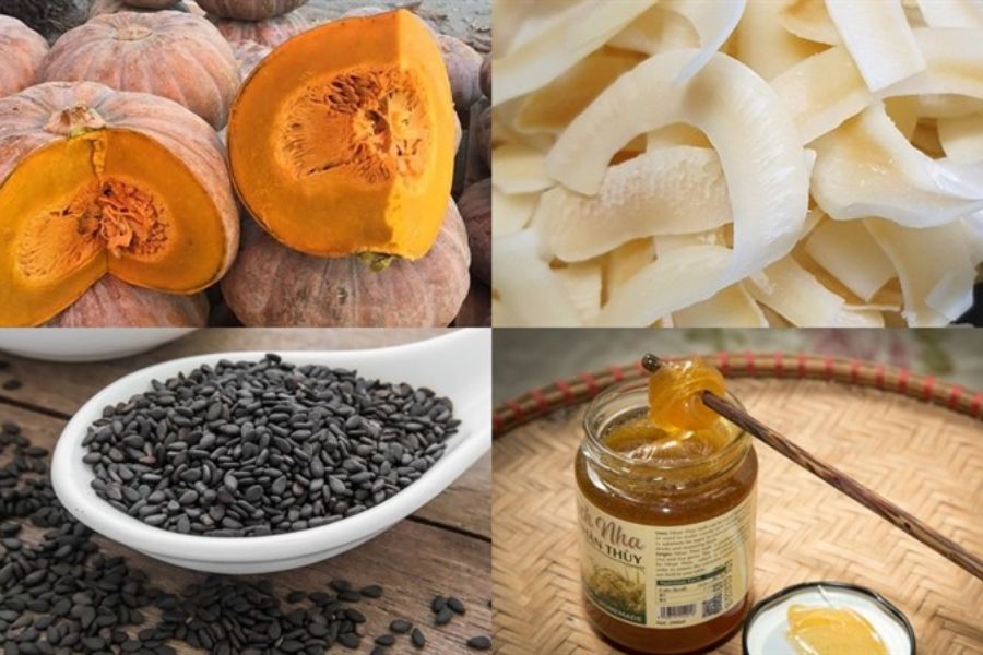- Đợi đến lúc bí đỏ dẻo và dính lại thành khối, bạn hãy từ từ bóp vụn 45 gram dừa sấy và 2 thìa mè đen vừa chuẩn bị vào. Lại tiếp tục đảo để các nguyên liệu quyện đều vào nhau.