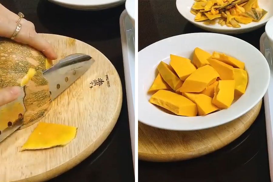Gọt sạch vỏ bí đỏ, thái miếng và đem rửa qua với nước lạnh.