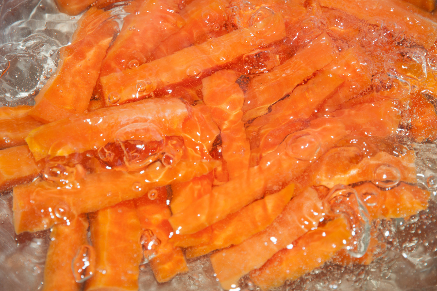 - Khi cà rốt vừa chín tới, chuẩn bị một thau đá lạnh rồi vớt cà rốt ra và ngâm vào. Điều này sẽ giúp cà rốt giòn, giữ màu sắc đẹp, đồng thời vẫn giữ được vị ngọt.