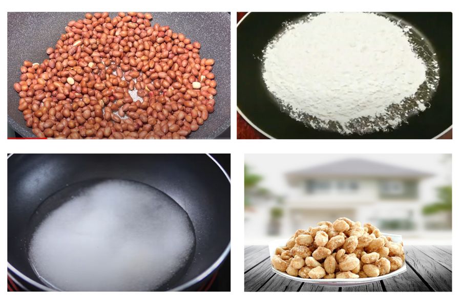 - Cho đường vào, đảo đều để đường chảy ra, áo lên đậu phộng đến khi khô lại.