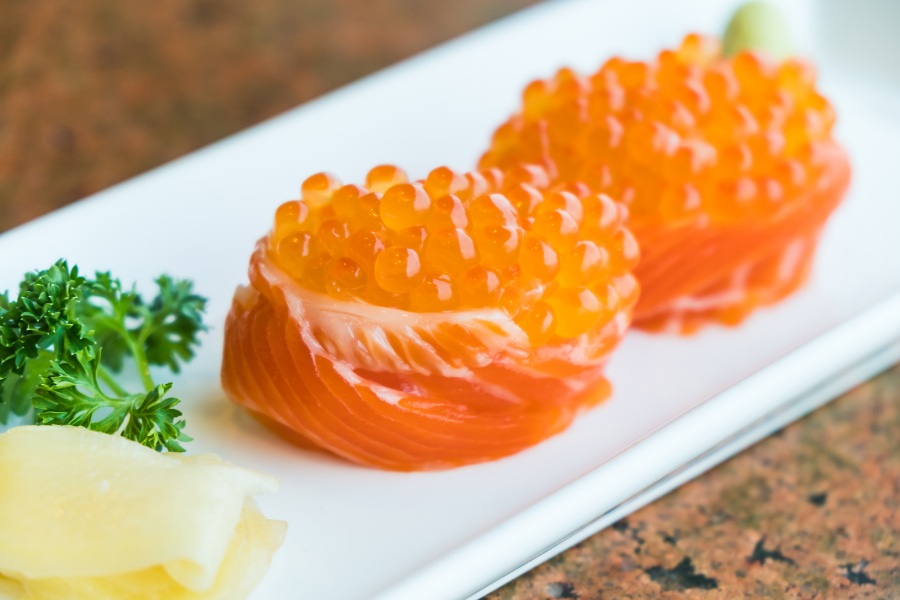 - Cuối cùng là cho trứng cá hồi lên trên, trang trí dĩa sushi cá hồi bằng gừng là hoàn thành rồi