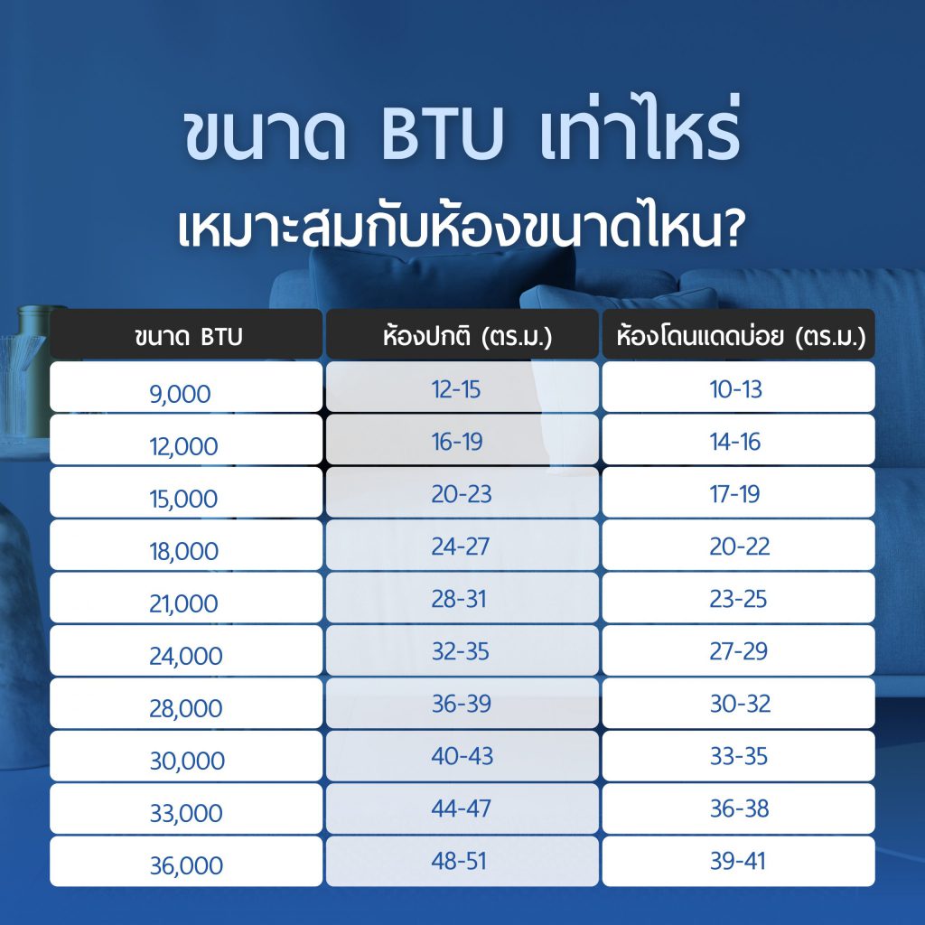 ขนาดของเครื่องปรับอากาศ เรียกว่า BTU โดยควรเลือกให้เหมาะกับขนาดของห้องให้มากที่สุด หากเลือกต่ำไปจะทำให้แอร์ และคอมเพรสเซอร์ทำงานหนักเกินไป หรือถ้าเลือก BTU สูงไปคอมเพรสเซอร์ก็จะทำงานน้อยเกิน และมีการตัดไฟบ่อย ทำให้ความชื้นในห้องสูงและประสิทธิภาพในการทำงานต่ำ จำนวนของ BTU ที่ควรเลือกใช้นั้นขึ้นอยู่กับขนาดของห้อง (กว้าง x ยาว) และตัวแปรอื่นๆ เช่น ห้องโดนแดดหรือไม่โดนแดด ความสูงของเพดานห้อง จำนวนคนในห้อง เป็นต้น