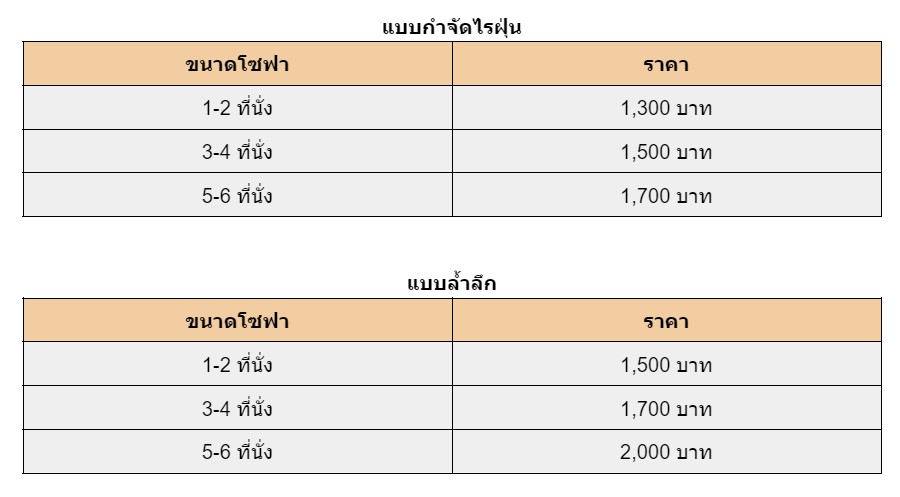 ตารางเปรียบเทียบค่าบริการซักทำความสะอาดโซฟาแบบกำจัดไรฝุ่น และแบบล้ำลึก (Deep Clean)