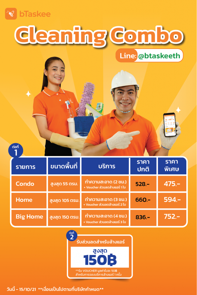 ซื้อแพ็กเกจ Cleaning Combo รับส่วนลดมูลค่ารวมสูงสุด 150 บาท สำหรับบริการทำความสะอาดเครื่องปรับอากาศ